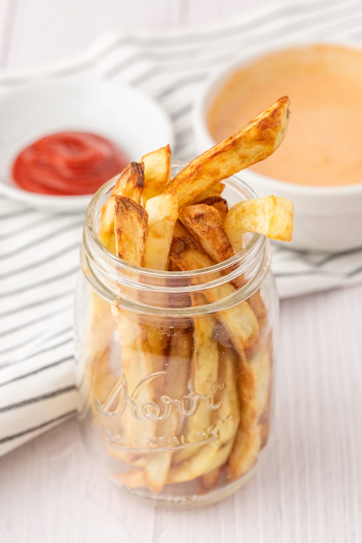 Serve with dipping sauce! Whether its ketchup, Spicy Whipped Feta, mayo, Easy Homemade Blue Cheese Dip, or French Fry Sauce – fries are delicious when you dip them into something!