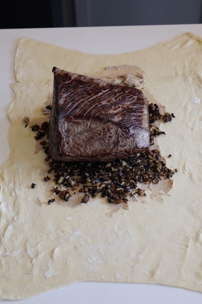 - Roll out the dough and assemble. On a lightly floured surface, roll out your dough into a rectangle, slightly larger than enough to completely cover the the roast. Spread room-temperature pate on the dough in the footprint of the roast. On top of the pate, even spread out the mushroom duxelle. Place the roast upside down on the pasty in the middle of the spread out pate and duxelle. Fold the pastry to cover the