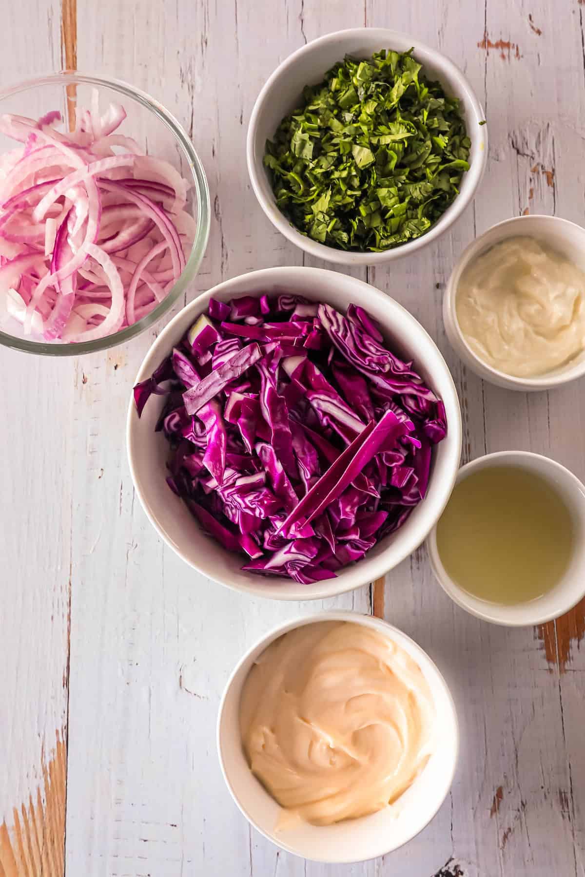 - Red onion (½ small) – Red onion adds a sharp, tangy flavor and a bit of crunch to the slaw.