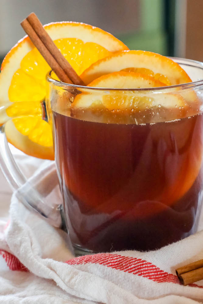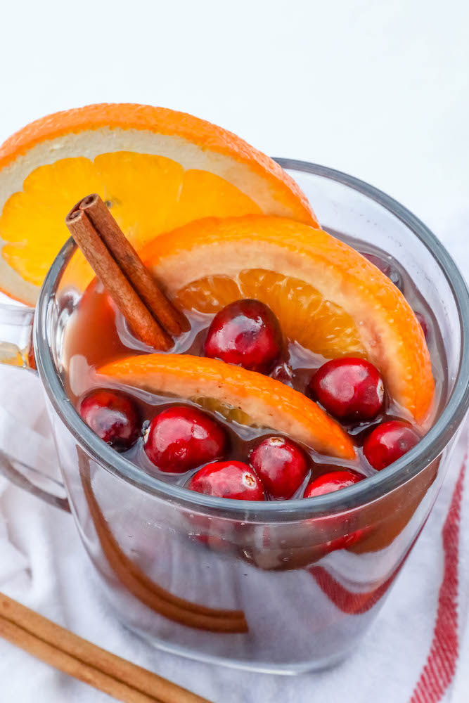 - Serve. Serve in Christmas mugs and add a cranberry, orange slice, and cinnamon stick if desired, and enjoy!